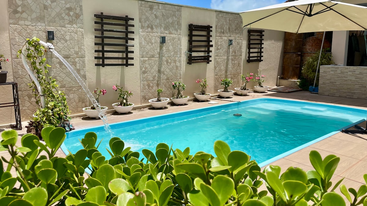 Lig do scíth i spás ciúin teolaí gleoite i gcroílár Ponta Negra, an trá is cáiliúla in Natal - RN. Tá an edicule seo foirfe do lánúineacha atá ag lorg compoird agus praiticiúlachta, le cistin chomhroinnte lasmuigh chun na béilí is fearr leo a ullmhú. Tá an suíomh faoi phribhléid, gar do bhialanna, beáir, bácúis agus margaí, chomh maith le rochtain éasca a thairiscint ar an Via Costeira agus Rota do Sol, cosáin as a dtagann na tránna is áille in Rio Grande do Norte.