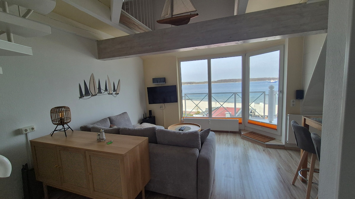 Ferienwohnung Strandkoje: Haus "Hotel Panorama", 1. Reihe an der Strandpromenade mit Meerblick, Maisonettewohnung im 3. OG, ca. 40 m², für bis zu 3 Personen, kombinierter Wohnbereich mit Boxspringschlafcouch, Balkon mit Panoramablick über die Förde, offene Küche mit Essplatz, Dusch-/Wannenbad, offene Empore, separates Schlafzimmer mit Doppelbett in der oberen Ebene, Tiefgaragenstellplatz, Aufzug im Haus