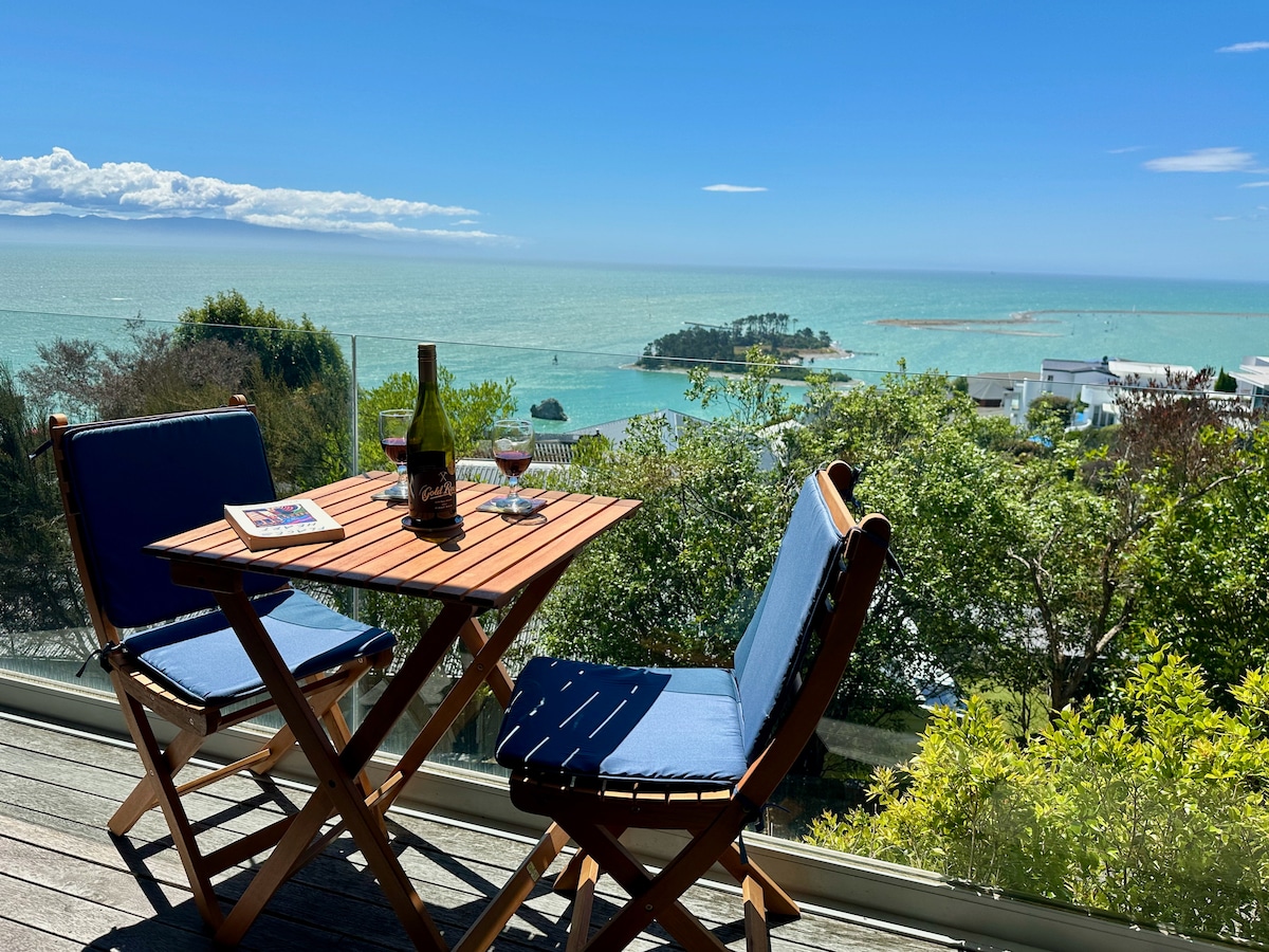Cuirimid Svuít phríobháideach ar fáil ina bhfuil radhairc ar an bhfarraige, seomra leapa dea - cheaptha ina bhfuil leaba rí. Osclaíonn doirse na Fraince ar phaitió ina bhfuil suíocháin lasmuigh. Seomra bricfeasta cluthar ina bhfuil cuisneoir, micreathonnán, agus saoráidí déanta tae/caife. Tá cithfholcadán agus folcadán sa seomra folctha ina bhfuil seomra leithris ar leith. Tá neart páirceála lasmuigh den tsráid agat le rochtain go díreach isteach san áit le haghaidh d'úsáid phríobháideach. Oiriúnach do thaistealaí aonair nó do lánúin. Níl sé suite ach gearrcharr ó Nelson CBD agus ar thaobh Picton den bhaile