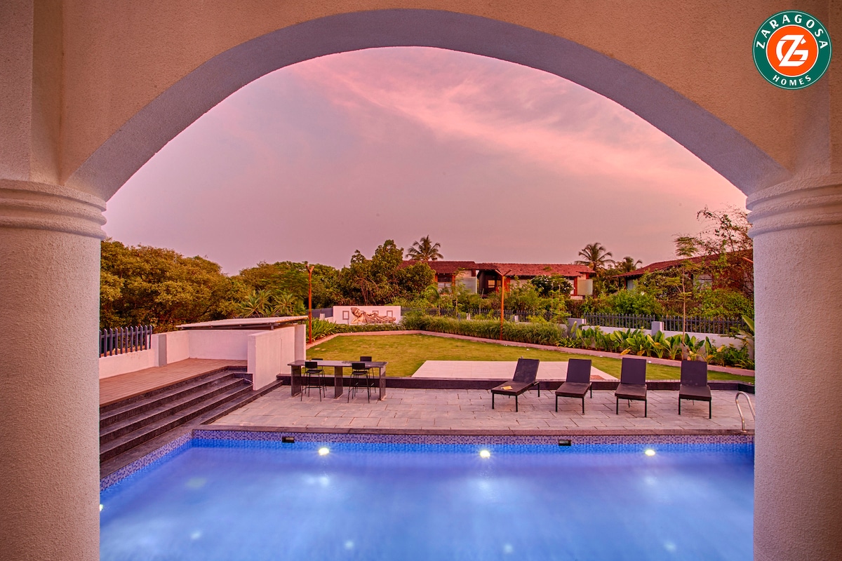 "Sunsaara Poolside Villa" Exquisite, Galánta gréine - drenched & soir - aghaidh. Eisíonn an limistéar maireachtála fairsing aer eisiachas, le feistis pluise agus décor blasta a chumascann compord agus stíl gan stró. Tá faiche ghlas mhéith thart ar linn snámha criostail - soiléir gan mhéith. Nuair a théann an ghrian, athraíonn an villa ina thearmann grá. Ciallaíonn treoshuíomh aghaidh thoir an villa go mbeidh suíochán tosaigh agat chuig éirí na gréine iontach gach maidin agus éirí na gealaí san oíche le dinnéar coinnle.