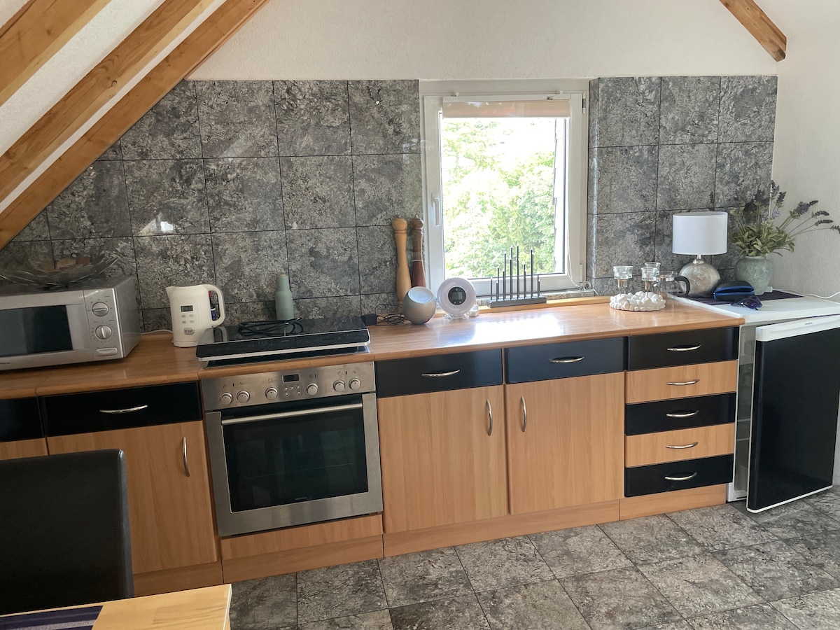 Suigh siar & lig do scíth... Níor cruthaíodh ár n - árasán aon seomra ach le hábhair thógála nádúrtha. Le go leor grá do mhionsonraí, tá slinn nádúrtha & adhmad darach próiseáilte agam anseo. Tugann an taobh istigh ardchaighdeáin cuireadh duit do scíth a ligean. Anseo, ag an ngeata go Vogelsberg tá an bealach isteach chuig conair rothar sléibhe an bholcáin "Mühlental ". Stáisiún luchtaithe rothar go díreach ag an árasán. Ina dhiaidh sin, sabhna? Má tá suim agat ann, tá seans ann casadh a ghlacadh le mo Sheanóirí sna Stáit Aontaithe ;-)