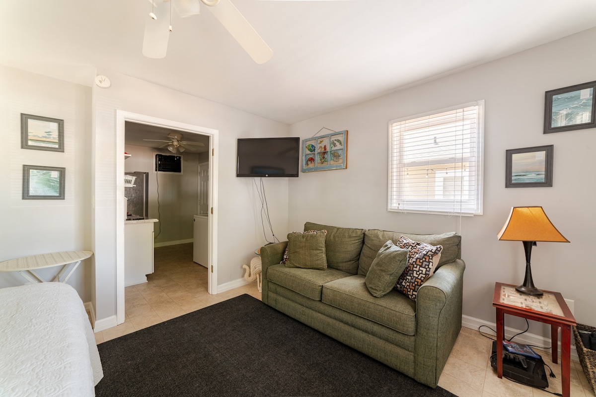 Tá seomra leapa amháin ina n - aonar sa stiúideo. Leaba de mhéid banríona, tarraing amach tolg dúbailte, cistinéad, meaisín níocháin/triomadóir, cuisneoir, agus seomra folctha mór. Teilifís 42" orlach le cábla, Roku agus Wi - Fi. Dhá bhealach isteach phríobháideacha atá inrochtana, deic mhór chomhroinnte, agus déantóir caife keurig Fad siúil/rothaíochta go lár Chathair Morehead, tiomáint ghearr cúig nóiméad go Beaufort agus Trá an Atlantaigh - tá an stiúideo seo i lár go leor gníomhaíochtaí. Níl peataí ar bith ann le do thoil. Ceamara neamhfheidhmiúil a bhaint lasmuigh den áitreabh