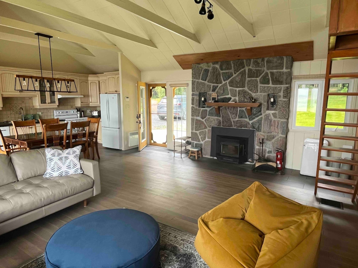 This brand-new ski chalet, built in 2025, is just 5 minutes' walk from the hill. It features two bedrooms, sleeping up to 6 with a pull-out couch, plus a full kitchen and a cozy electric fireplace. Relax in the custom shower or luxury bathtub, and enjoy Starlink internet and a 50-inch flat-screen TV. With a mudroom for gear, in-unit washer/dryer, and a hot tub for après-ski relaxation, it’s the perfect mountain retreat for your next getaway.