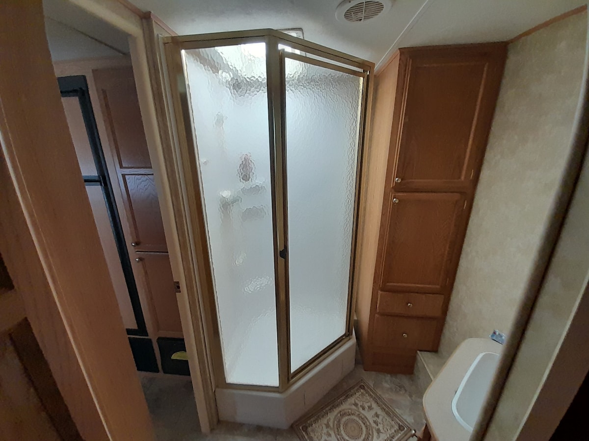 Bain sult as leantóir lánfheistithe 35.5ft 5ú roth ar a lán le máistir an Rí, teach buinc le 3 leaba, 2 sheomra folctha iomlána agus A/C U múnlaithe dinette agus tolg loveseat; sorn 3 dhóire agus oigheann própán; cuisneoir méid appartment, micreathonnán, tóstaer agus déantóir caife Keurig. Cuireann an chistin lasmuigh mionchuisneoir, déantóir oighir, friochtán aeir, doirteal, spás stórála agus beárbaiciú 4 dhóire ar fáil sa chistin lasmuigh. Tá suíocháin chompordacha ar an deic mhór adhmaid le bord tine própáin; bord agus 4 chathaoir.