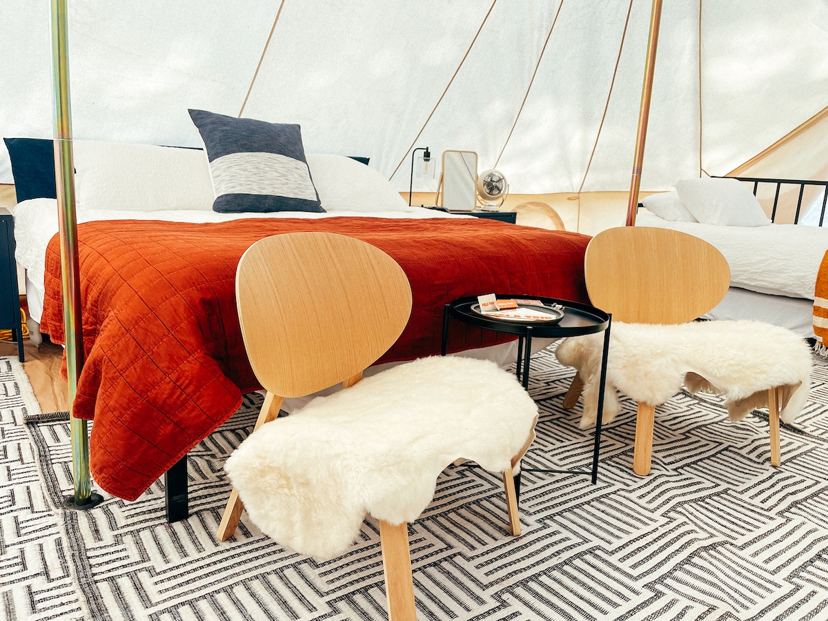 Déan teagmháil arís leis an dúlra ag an éalú dodhearmadta seo. Is breá leat an saol mór amuigh faoin aer ach fós ag iarraidh codladh ar leaba stuama ina bhfuil “ceap tochta téite” agus compord mór síos. Tá leictreachas feistithe sa phuball safari, agus teallach dóite adhmaid iarainn theilgthe taobh istigh chun fanacht te. Is é seo an áit is fearr chun taitneamh a bhaint as an bhfásach, suí taobh amuigh trí thine oscailte agus s'mores rósta, amharc ar Bhealach na Bó Finne agus siúl díreach amach ón talamh ar Fhásach Pecos. Níl ach 20 nóiméad ón Plaza stairiúil i lár an bhaile