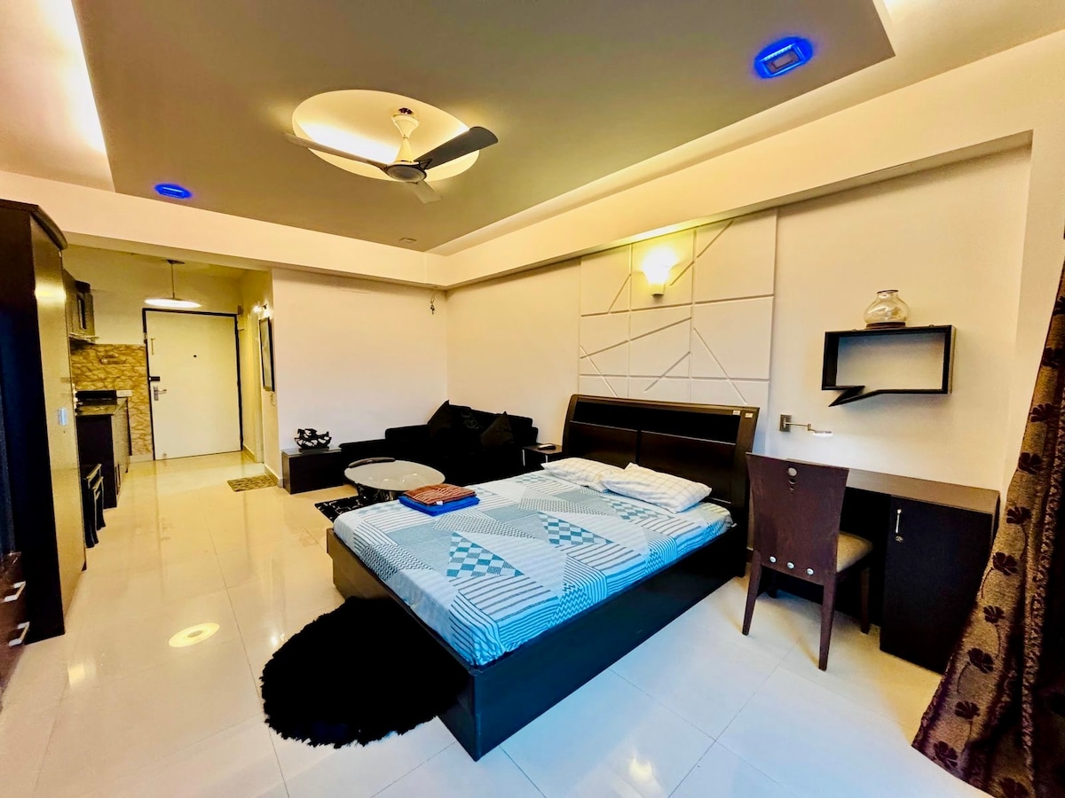 Árasán stiúideo cliste sómasach atá feistithe go hiomlán le balcóin, giomnáisiam, linn snámha agus gairdín atá os comhair an deiscirt (cairdiúil do lánúineacha ).Near Airport, CC2.Guests have fun with the whole family and friends. Tá an bhalcóin atá os comhair an deiscirt iontach. Cistin lánfheistithe le huirlisí ionduchtaithe, cuisneoir ,micreathonnán agus riachtanais laethúla. Wi - Fi ardluais os cionn 150 mbps. Cuirimid tae agus caife n spíosraí ar fáil ann freisin. Árasán stiúideo síochánta le féinseiceáil isteach.24 ×7 slándáil...Tabhair cuairt ar n taitneamh a bhaint as ❤️❤️