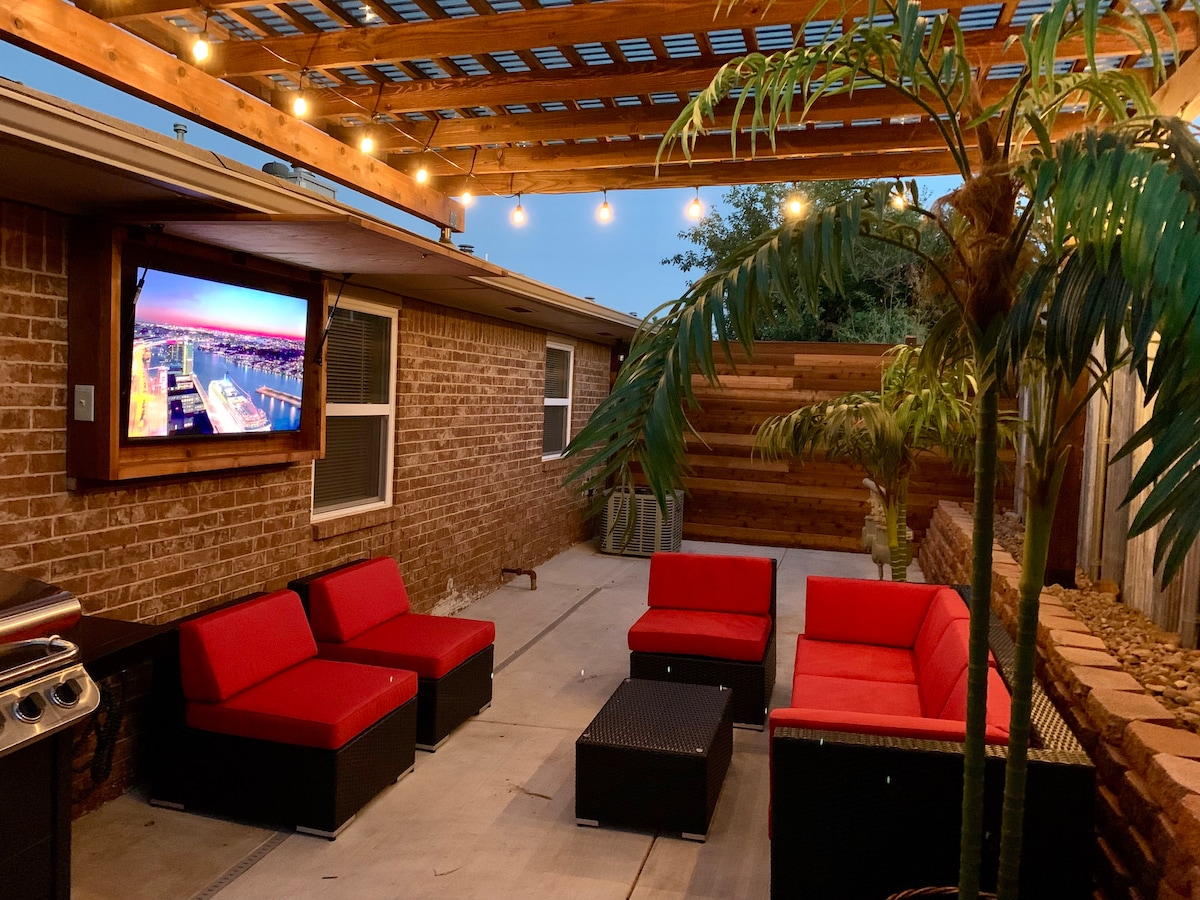 THIS IS A DUPLEX. Very quiet 3 bed 2 full bath offers unique private front courtyard, and back outdoor living room with TV & grill. Modern interior filled with art. Open living/dining/kitchen. Primary bedroom suite features KING size bed, 55” Smart TV, and spacious bathroom with walk-in shower. Secondary bedroom features KING size bed and TV. Perfect location minutes to restaurants and shopping. Out of town guests only. Easy access to all major interstates. Pets allowed ($40 per stay. )