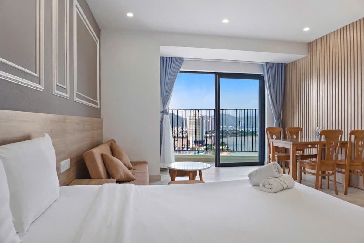 ✅️Studio apartment Nha Trang Center (Hoàn Cầu Building) 44m² ✅️Address: 20 Tran Phu, Loc Tho Ward, Nha Trang. ✅️The room is designed with 2 beds, one 1m bed and one 1.4m bed, comfortably accommodating 3 persons, a kitchen area fully equipped with cooking utensils... ✅️Large northeast-facing balcony, enjoy the sunrise over the sea from the balcony in the morning, and enjoy the shimmering lights from the pool at night. ✅️Standard accommodation for 3 adults, free for children under 12 years old.