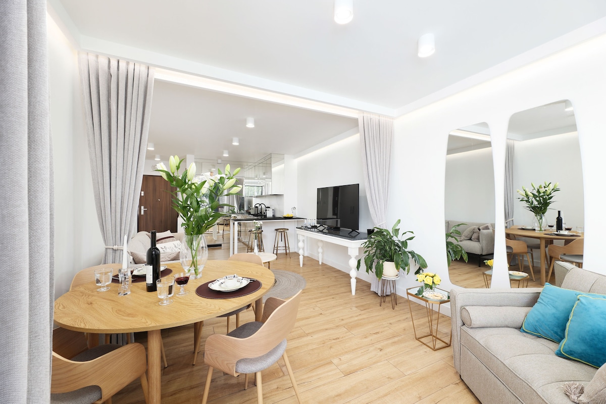 Árasán álainn, athchóirithe go hiomlán, fairsing (50 m2) i gcroílár na cathrach. Tá an t - árasán suite 3 nóiméad ag siúl ón bpríomhstáisiún traenach agus bus agus os comhair an ionaid siopadóireachta is mó in Galeria Krakowska. Mar sin féin, tá na fuinneoga os comhair pháirc álainn (Strzeleciki) a fhágann go bhfuil sé iontach a bheith taobh amuigh den bhaile leis an tress go léir timpeall air. Tá gach fearas nua sa chistin le breis, sorn, miasniteoir agus tógáil i déantóir Caife Bosh! Tá dearadh uathúil ag an áit