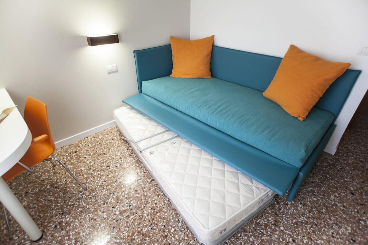 I gcroílár Noale, tá an t - árasán teolaí aon seomra leapa seo oiriúnach do thriúr. Comhdhéanta de sheomra leapa dúbailte agus mezzanine le leaba, cuireann sé compord agus feidhmiúlacht ar fáil. Ligeann an chistin fheistithe duit béilí a ullmhú i síocháin. Tá an suíomh straitéiseach: siúlóid ghearr ón stáisiún traenach go dtí an Veinéis agus na stadanna bus go Padua agus Treviso, rud a fhágann go bhfuil sé éasca agus tapa dul timpeall. Cuireann bialanna agus siopaí áitiúla tipiciúla eispéireas barántúil ar fáil sa bhaile stairiúil
