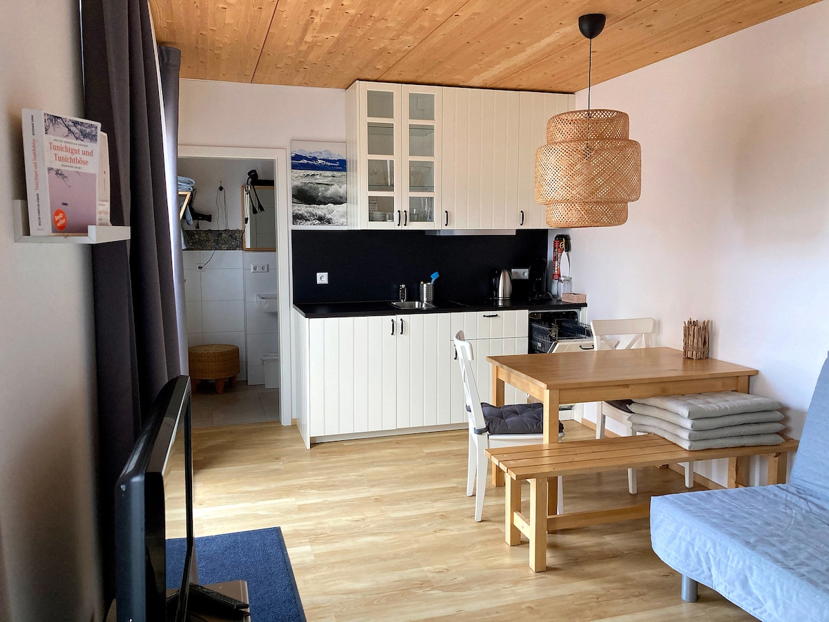 I sráidbhaile Retterschen, níl ach 1 km ó Kressbronn agus Lake Constance, tá ár n - árasán ar an 3ú hurlár. Is féidir le seomra leapa amháin ina bhfuil leaba dhúbailte agus leaba thoilg sa seomra ina bhfuil cónaí ar an gcistin freastal ar suas le 4 aoi. Tá an chistin feistithe le gach rud atá uait. Déanann bord bia, an tolg teolaí agus teilifíseán an seomra foirfe chun do scíth a ligean. Tá cithfholcadán, doirteal agus triomadóir gruaige feistithe sa seomra folctha. Leithreas ar leith. Gairdín mór le clós súgartha, teach súgartha, imfhálú coinín...