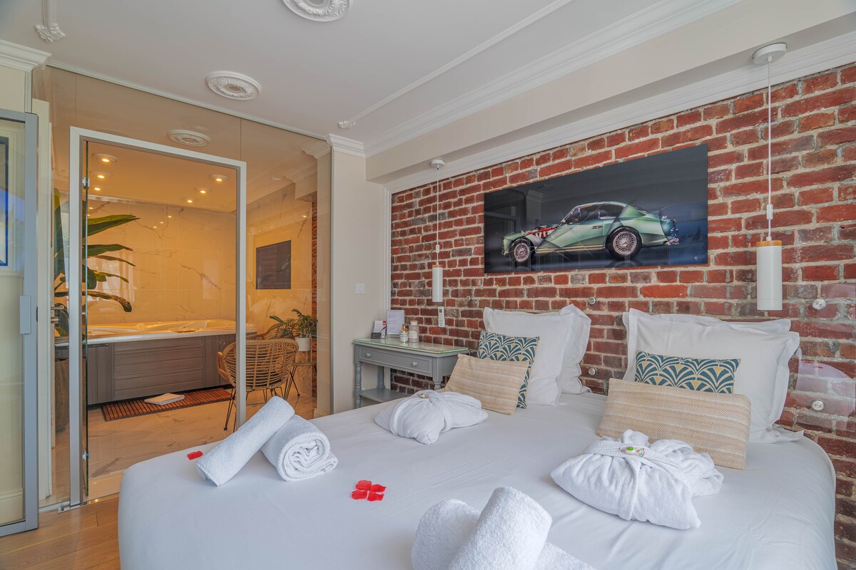 Une suite digne d’un SPA privatif ! Vous trouverez dans cette suite de 35m2 tout le confort pour une nuit douillette ! Vous pourrez profiter seul ou en amoureux d’une douche hammam ainsi qu’un jacuzzi professionnel deux personnes privatifs avec télévision connectée à Netflix, dans une ambiance colorée de votre choix. La suite est équipée d’une cafetière Nespresso, d'une bouilloire, d'un mini bar et d'un micro-onde.