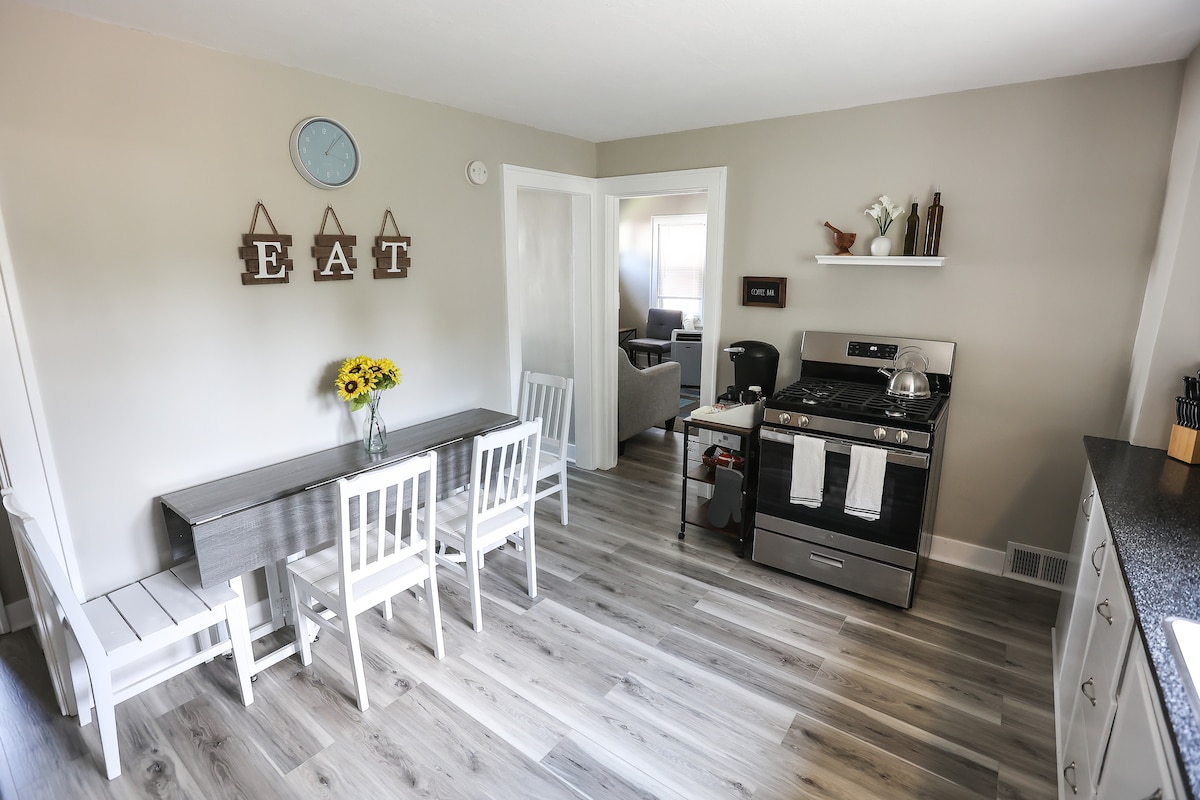 Aonad uachtarach galánta nua - athchóirithe a thairgeann 2 sheomra leapa (lena n - áirítear leapacha buinc lánmhéide) agus tolg banríona tarraingthe amach. Neadaithe in aice le Feirm serene Blueberry Treehouse agus díreach chuimhneacháin ó Phríomhshráid ghalánta East Aurora. Bain sult as rochtain éasca ar Pháirc an Úlloird, Ellicottville, Downtown Buffalo, Highmark Stadium, Chestnut Ridge Park, agus go leor eile. Foirfe le haghaidh tearmann suaimhneach nó saoire ghearr uasscála. Páirceáil in aisce san áireamh.