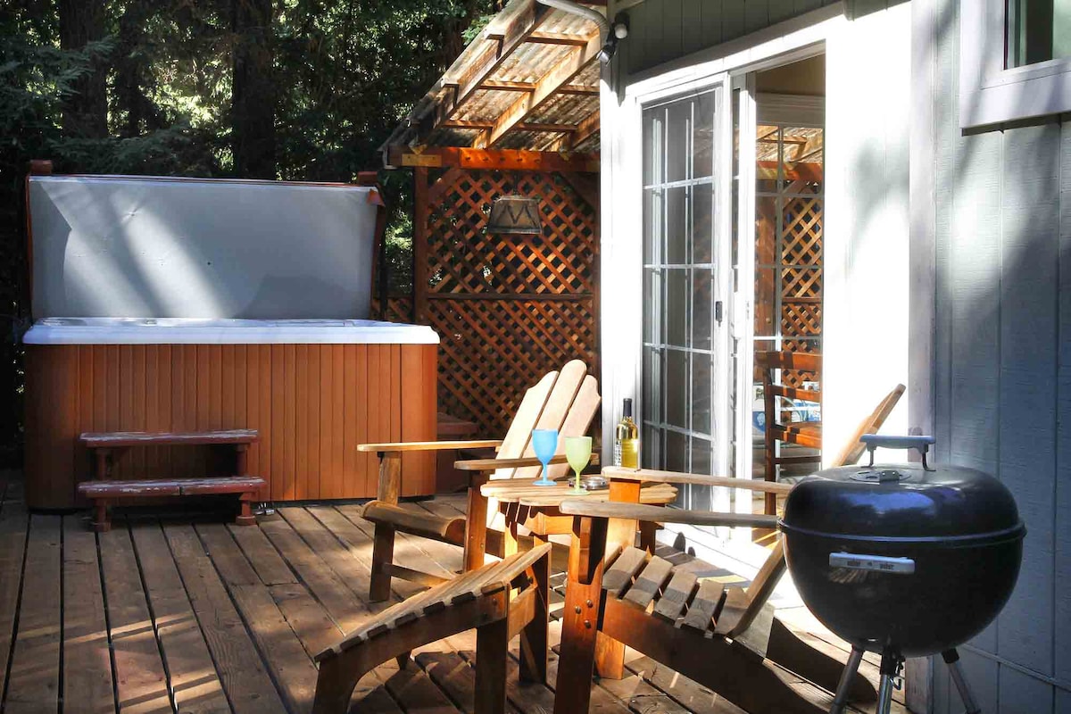 Fáilte go dtí ár Redwood Treehouse Retreat, áit a mbuaileann teolaí le só i gcroílár an dúlra. Neadaithe sna crainn ársa, cuireann an t - éalú rómánsúil seo príobháideacht agus sólás ar fáil. Lig do scíth sa tobán te, teolaí cois tine, athluchtaigh do EV, agus déan iniúchadh air. Táimid lonnaithe go lárnach: 5 nóiméad ó Occidental, 10 nóiméad go trá Abhainn na Rúise/Monte Rio, 20 nóiméad go cósta/Sebastopol, agus 30 nóiméad go Healdsburg. Bunáit fhoirfe chun iontais uile an réigiúin ghalánta seo a aimsiú. Tá do shaoire ghearr bhrionglóideach chúlráideach ag fanacht leat.