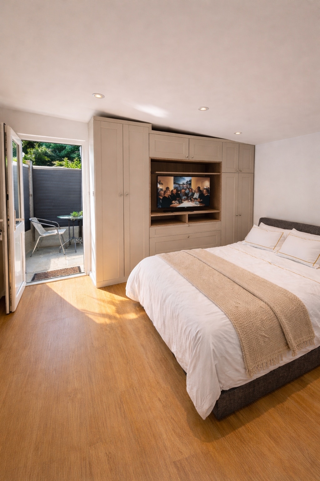 Tá an áit ghalánta seo foirfe do thaistealaí aonair nó do lánúin. Tá sé go hiomlán príobháideach le bealach isteach príobháideach. Tagann micreathonnán, tóstaer, citeal, gréithe agus rogha tae & caife le cistinéad. Tá spás do bheirt san áit itheacháin atá os cionn an ghairdín agus dúblaíonn sé mar spás oibre. Tá aonad cithfholcadáin le huisce te sa seomra folctha. Tagann téitheoirí leictreacha agus blaincéid bhreise leis an seomra. Spórtlann iomlán lasmuigh ar an láthair. Tá seirbhísí breise (meaisín níocháin & cistin iomlán) le fáil sa teach (spás comhroinnte).
