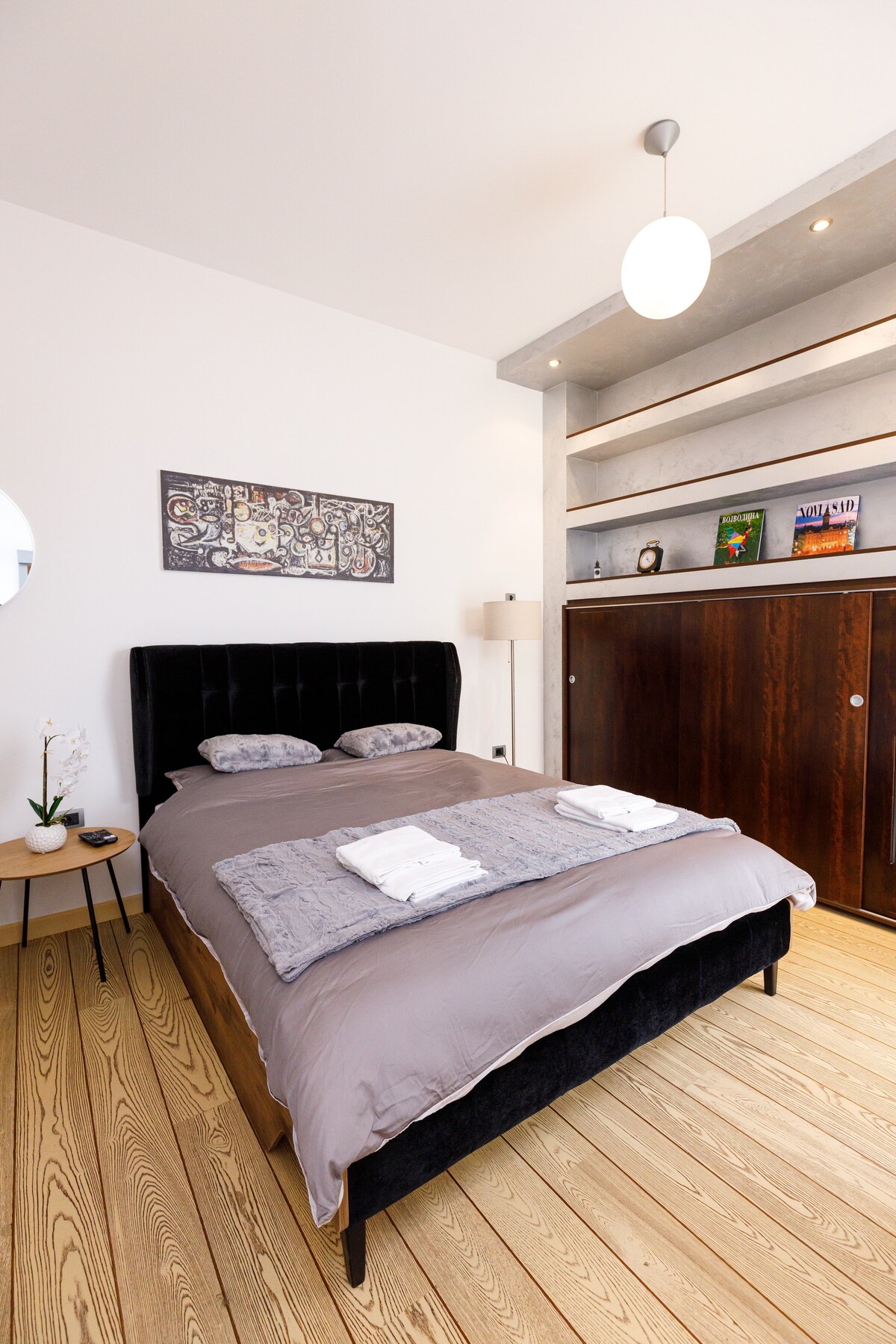Tá an t - árasán fairsing 1 sheomra leapa nua - athchóirithe seo suite ar an 2ú hurlár le radharc cois páirce ar Phálás Banovina atá uathúil ó thaobh na hailtireachta de agus atá suntasach ó thaobh na staire de. Níl ann ach siúlóid 7 nóiméad ó: - ainm Eaglais Mháire - príomhshráid na cathrach agus crios coisithe atá lán le bialanna agus beáir - Cé abhann na Danóibe Tá sé 1.3 km (0.8 míle) ar shiúl ó Fortress cáiliúil Petrovaradin, tiomáint 6 nóiméad ó Thrá na Cathrach, agus tiomáint 30 nóiméad ó Pháirc Náisiúnta álainn Fruška Gora.