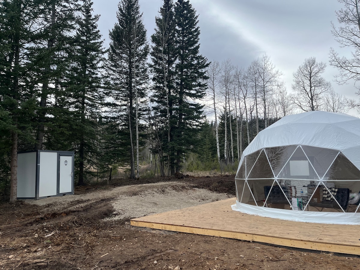 Faigh blaiseadh de ghlampáil uile - shéasúir i bhfásach untouched Alberta. Tugann ár geodome cois locha stargazing gan sárú & deis chun éirí as an eangach. Fág slán le fearas campála a phacáil agus a chur ar bun – tá sé clúdaithe againn. Caith níos lú ama ag ullmhú & níos mó ama san eachtra enchanting a chuireann glampáil ar fáil. Taobh istigh, leapacha pluise & línéadach bog chun compord a chinntiú. Glac le huathúlacht d'fhanachta inár gcruinneachán atá deartha go cruthaitheach, tearmann foirfe a gheallann cuimhní cinn ar fiú a shuiteáil.