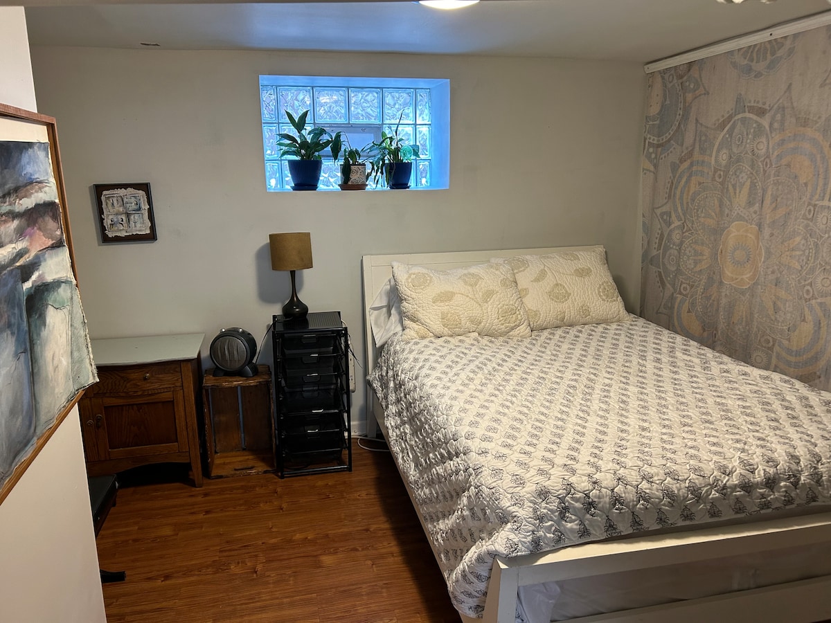 Árasán stiúideo in íoslach de theach príobháideach. Bricfeasta ilchríochach! Siúl chun traenáil go lár Chicago, bialanna agus beáir áitiúla. Fáilte roimh pheataí. Fálaithe i gclós, i bpaitió lasmuigh, i bpoll dóiteáin agus i bpluais fear. Bealach isteach príobháideach .*Tabhair faoi deara doras isteach i ngrianghraif Nóta: Teorainn 25 punt ar mhadraí!🤓