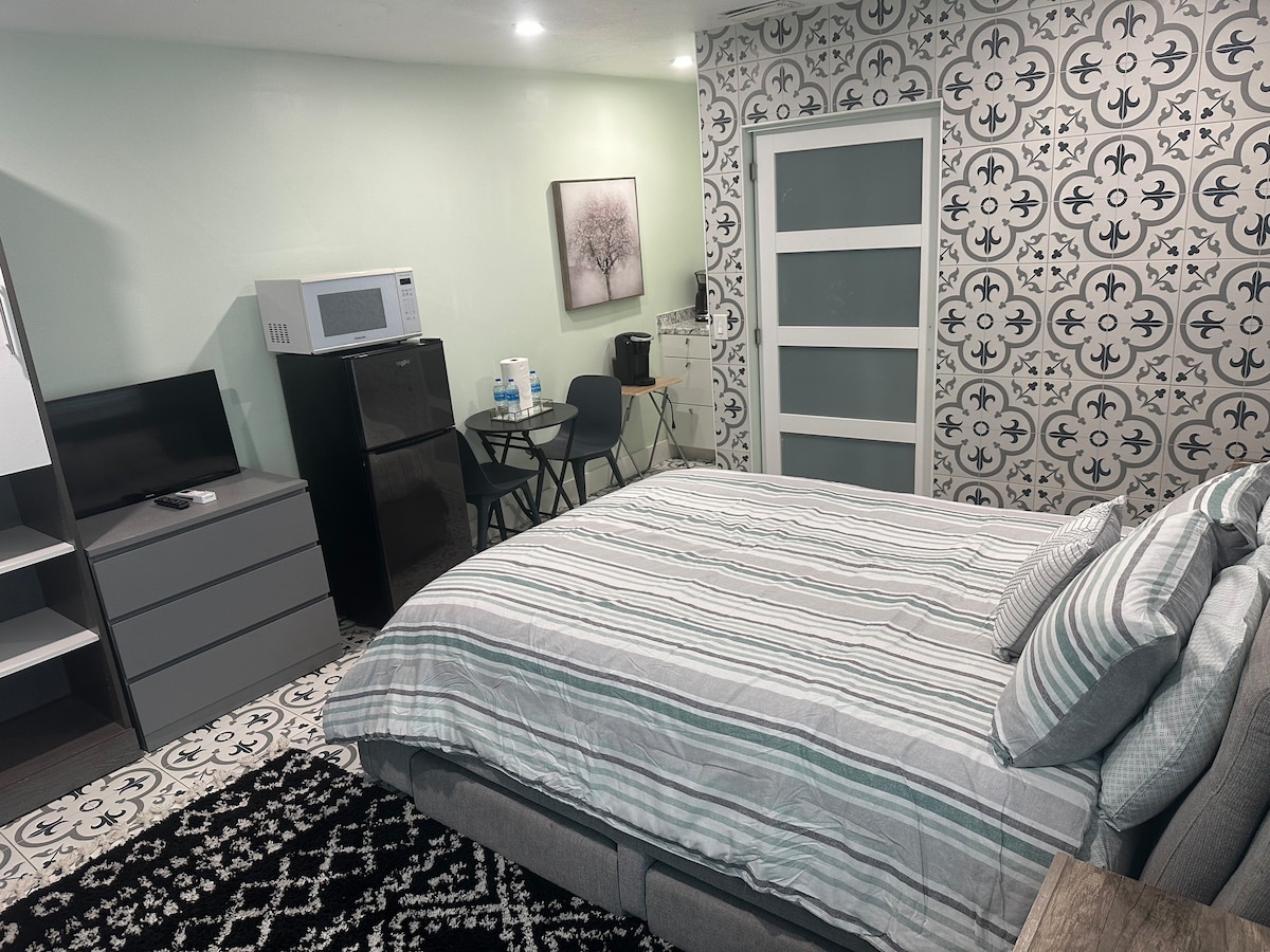 Níl sa stiúideo nua - athchóirithe seo ach 15 nóiméad sa charr chuig Aerfort fLL agus uaidh - oiriúnach do lánúin (2 dhuine ar a mhéad). Is tiomáint 20 nóiméad é chuig an Trá Bhalla Thonn íocónach ag Las Olas. Cuireann an stiúideo seo, (agus é in aice le foirgneamh ilaonad), príobháideacht iomlán ar fáil le gach doras rochtana ar an taobh amuigh agus rochtain eisiach trí eochaircheap duit féin agus do do chompánaigh taistil amháin. San áireamh tá: Seomra Folctha Iomlán, Mionchuisneoir/Micreathonnán, Leaba Rí, Teilifís, Deasc & Cathaoir Seiceáil isteach: 3 PM Seiceáil amach: 10 AM