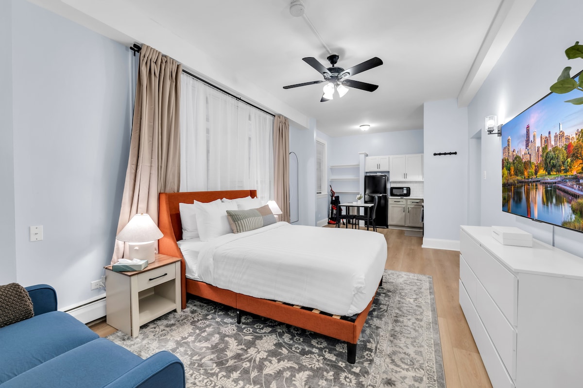 Stiúideo cluthar, lán de sholas na gréine i Hyde Park, díreach cúpla bloc ó UChicago. Bain sult as leaba bhanríona chompordach, folcadh príobháideach, Wi-Fi tapa, agus cistin lán le gach bunriachtanas. Suite ar shráid chiúin, crainn ar gach taobh i gcomharsanacht shábháilte, insiúlta in aice le caiféanna, bialanna, páirceanna agus músaeim. Rochtain éasca ar CTA agus Metra le haghaidh turais go lár na cathrach. Foirfe do thaistealaithe aonair, do lánúineacha, agus d'acadóirí ar cuairt atá ag lorg compord, áisiúlacht, agus atmaisféar fáilteach, te.