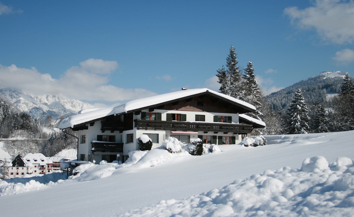 Árasán fairsing ina bhfuil ardán príobháideach. Lánléargas sléibhe le grian go dtí go déanach sa tráthnóna! Tá an t - árasán inrochtana ag ardaitheoir. Cistin lánfheistithe, leapacha adhmaid soladacha ardchaighdeáin don chompord codlata is fearr. Radharc ar an Wilder Kaiser san áireamh! Sabhna péine iontach le radhairc lánléargais! Níl ach 1 nóiméad siúil go dtí an bus sciála. I gcarr i gceann 5 nóiméad i lár Kitzbühel. Tá an réadmhaoin suite idir na háiteanna sciála & fánaíochta in Kitzbühel agus Jochberg. Naisc iompair fhoirfe.