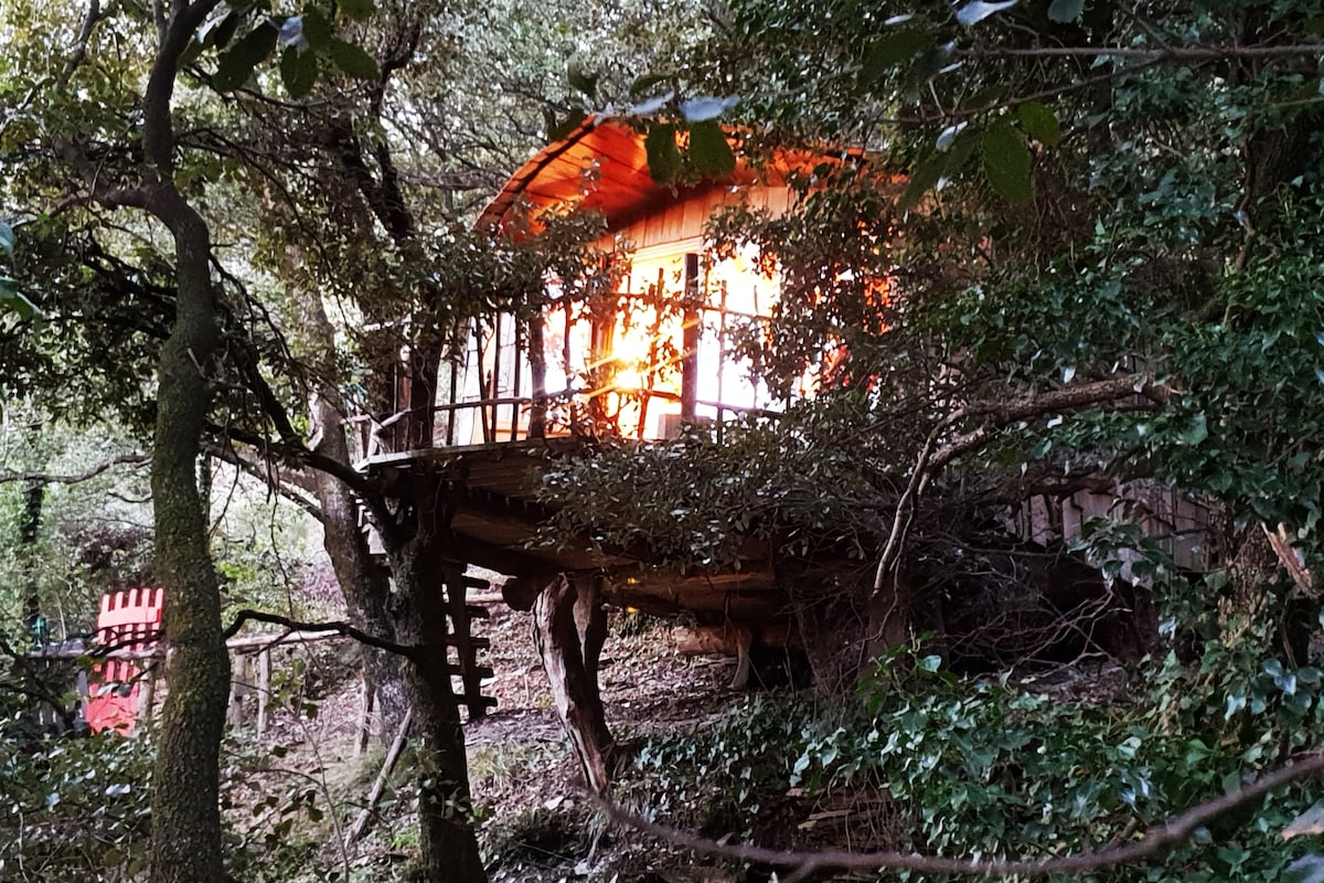 Chambre ronde posée dans les chênes verts au dessus du ruisseau avec une terrasse suspendue. Baignoire, WC, Lavabo, Lit double. La cabane se trouve au dessus du mas Lou Abeilhs avec une vue plongeante sur la vallée. Pour y accéder du parking il y a un petit chemin de 150m et une quarantaine de marches. A partager avec un autre couple, sur la grande terrasse du bas une cuisine extérieur, toute équipée, est à votre disposition.