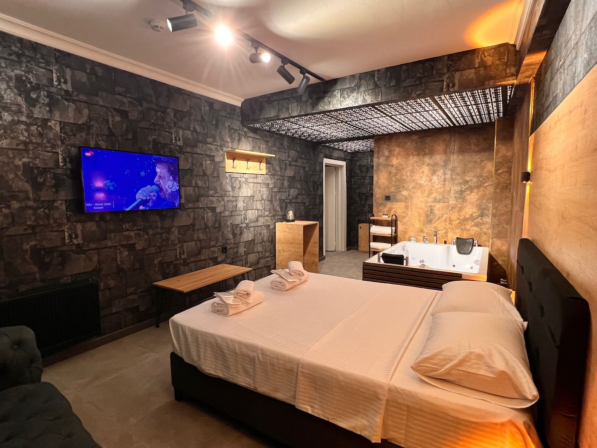 Tá ár leapacha breise (2 mhéadar) inár n - óstán i lár na cathrach. Tá tobán te inár seomraí go léir ionas gur féidir leat leas a bhaint as réadmhaoine leighis an uisce theirmigh. Sna tobáin hidrimáis, beidh an compord i do sheomra folctha chun do scíth a ligean go hiomlán agus go fisiciúil agus chun fáil réidh le strus.