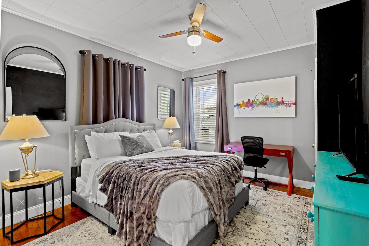 Bain sult as suaimhneas agus suaimhneas ag ár dteach nua - aimseartha i suíomh príobháideach díreach 5 nóiméad gearr ó Downtown St Louis. Beidh uisce buidéalaithe comhlántach, bricfeasta ilchríochach (muifíní pacáistithe) agus fíon buidéil pamper tú an nóiméad a thagann tú.Unwind in our luxurious multifunction shower +memory foam mattress Test your swing on our scenic driving mat or unwind around the crackling outdoor fire pit. Tá pacáistí breiseáin Spa agus Occassion Speisialta ar fáil. Páirceáil phríobháideach lasmuigh den tsráid.