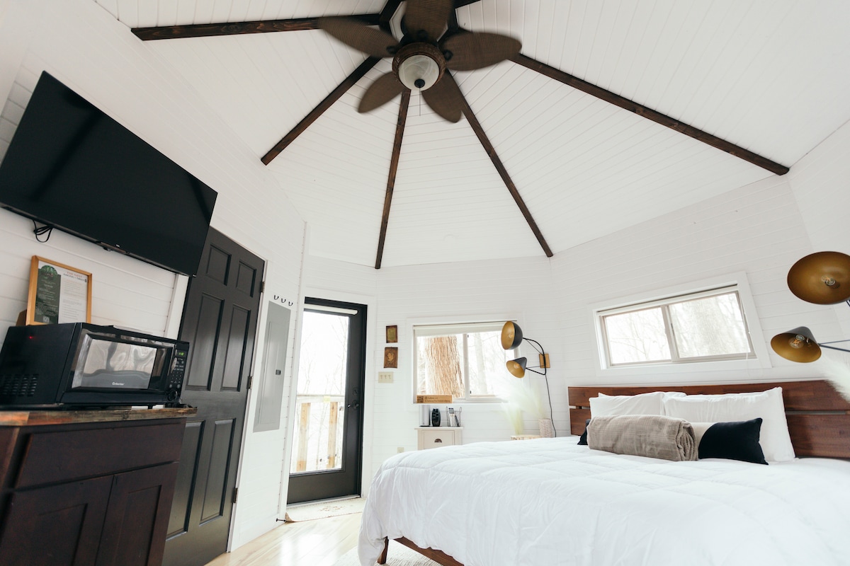 Fáilte go dtí ár DTEACH CRAINN trí Living The Dream Cabins! Lig do scíth agus lig do scíth i measc na gcrann inár dteach beag bídeach teolaí i stíl stiúideo. Bain sult as áilleacht Pháirc Stáit Hocking Hills le radhairc dhochreidte ónár ndeic fillte, ach freisin suite go háisiúil thart ar 15 nóiméad go dtí Pluais an tSeanfhir, Pluais na Fuiseoige, agus Conkle's Hollow State Nature Preserve!