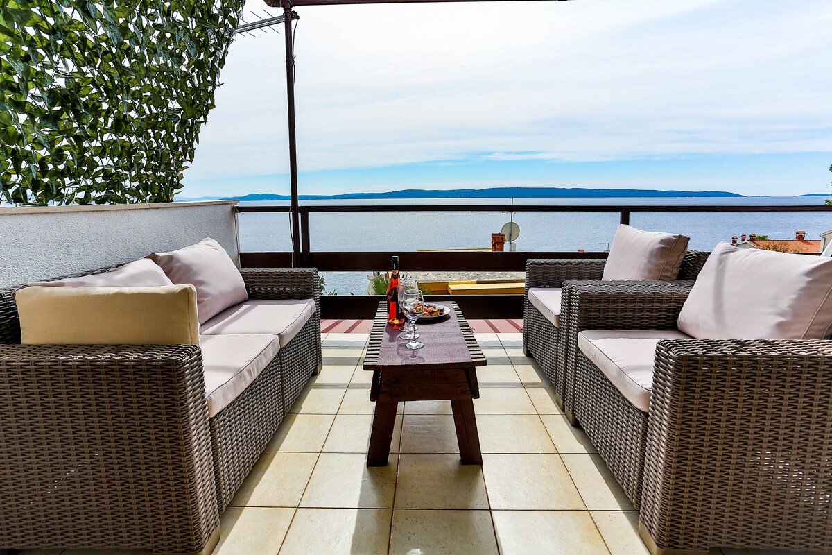 Tá Villa Marin suite sa chéad sraith cois farraige. Tá an linn snámha 8x4x1,4 méadar. Is féidir leat taitneamh a bhaint as an bhfarraige álainn gorm ó gach seomra. I mí an Mheithimh 2017. bhí sé críochnaithe le hatógáil iomlán an taobh istigh agus an taobh amuigh. Tá tolg sa seomra suí ar féidir leis a bheith an - chompordach le codladh ann do bheirt (200x160 cm ). Tá cúpla seomra leapa amháin ann (200x180 cm ). Gach ceann de dhá leaba dhá sheomra leapa eile ar féidir iad a dheighilt de réir mar is gá. Is é limistéar an villa agus an enviroment 600 m2.