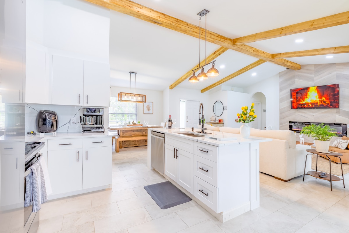 Indulge in Old Florida with our Boho Chic estate combining mid-century modern esthetics with tropical flare. Complete with a whole house Reverse Osmosis system, a heated saltwater pool + spa, a sprawling carefully maintained property with hundreds of mature trees, you can enjoy Florida living in privacy and style. You might even spot some wildlife! You'll have a beautiful master suite, a fully equipped kitchen, a 75" smart TV, several dedicated desks, a Weber grill, a fire pit, and more.