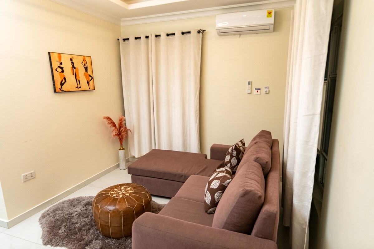 Bain sult as fanacht suaimhneach compordach san árasán cluthar seo ina bhfuil seomra leapa amháin agus seomra folctha en-suite, seomra suí agus seomra leapa aerchóirithe, cistin lánfheistithe, ardán príobháideach, páirceáil saor in aisce, teilifíseáin sa dá sheomra agus meaisín níocháin. Tá an t-árasán suite i gcomharsanacht chiúin ina bhfuil rochtain éasca ar shiopaí agus ar iompar, agus tá sé foirfe do thaistealaithe aonair agus do lánúineacha. Tá liúntas fóntais réamhíoctha laethúil de GHS 30 agus 6 GB d'Idirlíon san áireamh. Beidh costas ar aon úsáid bhreise ar an aoi.