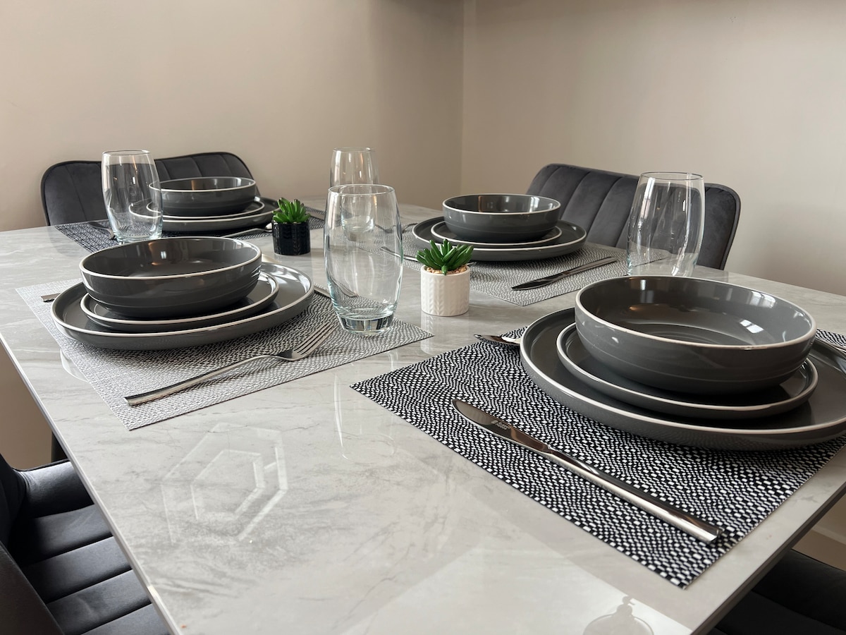 Fáilte chuig ár teaghasán gleoite, meascán foirfe de chompord agus stíl atá neadaithe i gcomharsanacht shíochánta. Cuireann an teach seo eispéireas maireachtála uathúil ar fáil lena leagan amach fairsing agus lena ghnéithe nua - aimseartha. Cibé acu an bhfuil tú anseo le haghaidh saoire ghearr ag an deireadh seachtaine nó le haghaidh fanacht fada, cuireann ár teaghasán an bonn baile iontach ar fáil chun iniúchadh a dhéanamh ar an gcathair chomh maith le Manchain atá ceangailte le turas traenach 15 nóiméad nó tírdhreach álainn na tuaithe. Táimid ag tnúth le tú a óstáil!