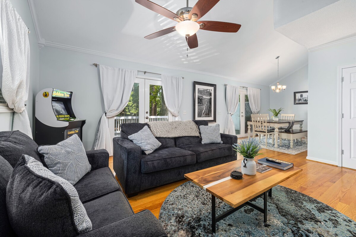 Teach uathúil ó fholcadáin dhéanacha na 70í, staighre bíseach agus fuinneoga ó bhalla go balla. Glac céim groovy siar san am - bain sult as a bheith i do shuí sna tréada i bpobal gailf geataithe. Tá maisiúchán tréimhse le feiceáil sa 2 sheomra leapa banríona agus sa dá sheomra folctha ach tá siad fós sómasach agus compordach. Tá barrán cúr 3 orlach ar tholg níos codlata. Tá an chistin feistithe go hiomlán le keurig (cochaill, uachtaráin, siúcraí), oigheann/cuisneoir lánmhéide, earraí cócaireachta, miasa, uirlisí, miasniteoir iniompartha. Cuirtear cuaillí iascaireachta ar fáil nó imríonn siad cúpla babhta gailf.