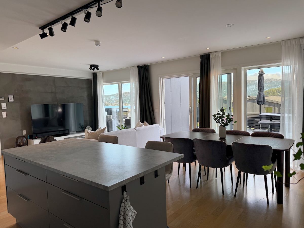 Moderne villa med perfekt beliggenhet. Huset har egen hage og stor vestvendt terrasse med fantastisk utsikt over innseilingen til Bergen by. Meget gode solforhold helt til solen går ned. Kun 2 min gange til buss til Bergen Sentrum. Kort vei til Øygarden/Sotra og Askøy. Gode turmuligheter i nærområdet. Kun 15 min med bil til Flesland.