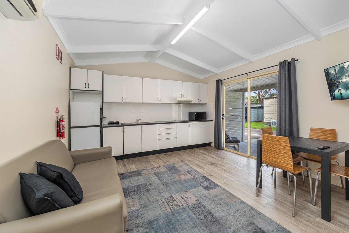 Cábán meallacach i Suíomh Suaimhneach Duilleogach, Lonnaithe go Breá i mBá Nelson Neadaithe i dtimpeallacht shíochánta dhuilleogach, cuireann an cábán seo atá feistithe go galánta tearmann suaimhneach ar fáil agus tú a choinneáil gar do gach rud atá ar fáil in Port Stephens. Foirfe do dhaoine singile nó do lánúineacha, is é an bonn foirfe é chun iniúchadh a dhéanamh ar áilleacht nádúrtha agus ar nithe is díol spéise spreagúla sa cheantar. Tá lár bhaile Bhá Nelson laistigh de shiúlóid 10 nóiméad. Tá siopaí éagsúla ann do do bhunriachtanais go léir le roghanna iontacha bia agus caife.