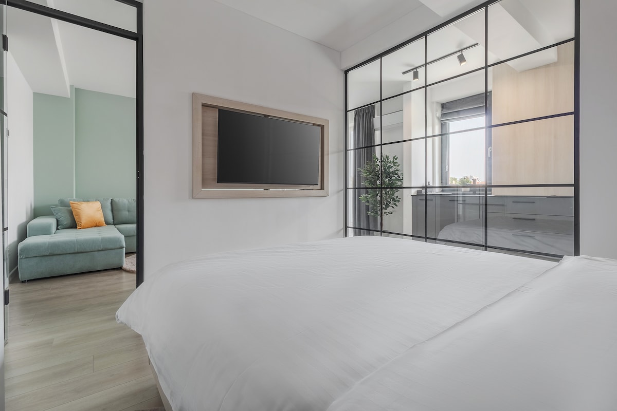 Lonnaithe i lár na cathrach, níl tú ach céimeanna ar shiúl ó na bialanna, na caiféanna, na siopaí agus na nithe is díol spéise cultúrtha is fearr. Tá seomra suí cluthar san árasán seo atá deartha go cúramach ina bhfuil suíocháin phluise, teilifíseán cliste, agus soilsiú bog le haghaidh oícheanta scíth a ligean ann, seomra leapa suaimhneach ina bhfuil leaba ar mhéid banríona ina bhfuil línéadach tí ardchaighdeáin, seomra folctha gleoite ina bhfuil cithfholcadán báistí, earraí níocháin den scoth, agus tuáillí clúmhacha agus cistin lánfheistithe ina bhfuil fearais nua - aimseartha agus gach rud a theastaíonn uait chun béile a fhuipeáil.