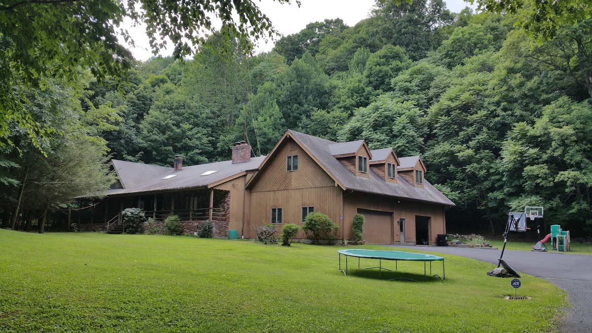 The charm of Upstate NY meets the adventure of the Poconos—right at your doorstep. Unwind and Recharge at our serene, one of a kind A-frame nestled on 4 private acres. Enjoy a sunken hot tub, chef’s kitchen, 135" theater, arcade, fire pit and a tranquil creek running through, providing a soothing soundtrack to your stay. Located at a unique tristate meeting point surrounded by charming towns, local farms, vineyards, near by activities like hiking, skiing, sky diving and water sports. NO PETS