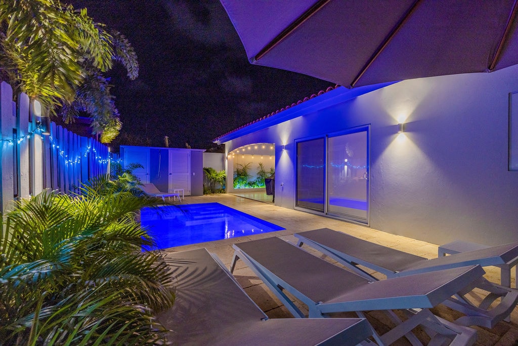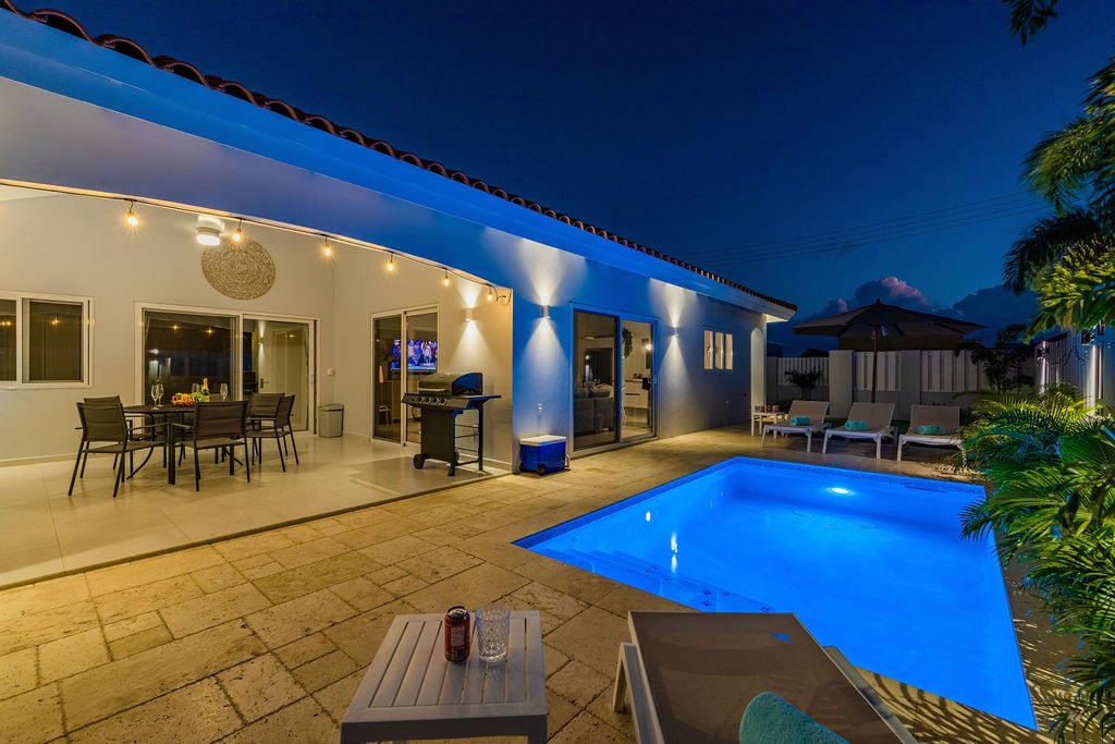 Faigh blaiseadh de Aruba ó chompord an tí nua - aimseartha, compordach seo ina bhfuil siúlóid 5 nóiméad chuig cuid de na tránna is mó ar domhan. Tá an teach i gcomharsanacht an - chiúin ina bhfuil cúlchlós PRÍOBHÁIDEACH. Bain sult as do linn snámha spéirghorm féin, beár - b - te, beár tiki, agus áiteanna suí. Rogha den scoth do theaghlaigh ar mian leo cónaí ar nós mhuintir na háite ar an oileán agus taitneamh a bhaint as bialanna, clubanna oíche, ionaid saoire, malls agus tránna in aice láimhe.
