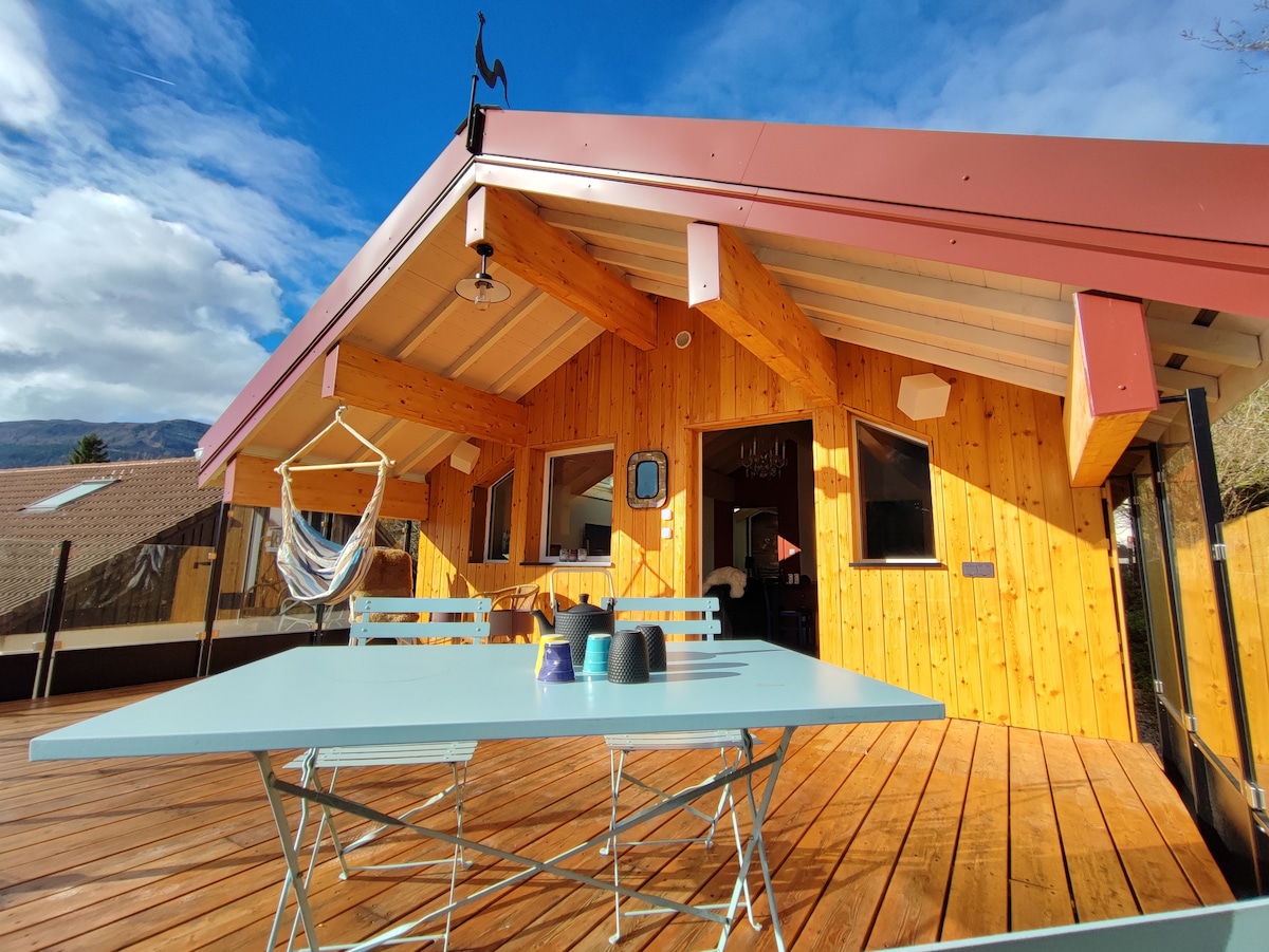 Teach a bhfuil radharc ar an díon agus ar an loch ina bhfuil teallaigh theolaí.