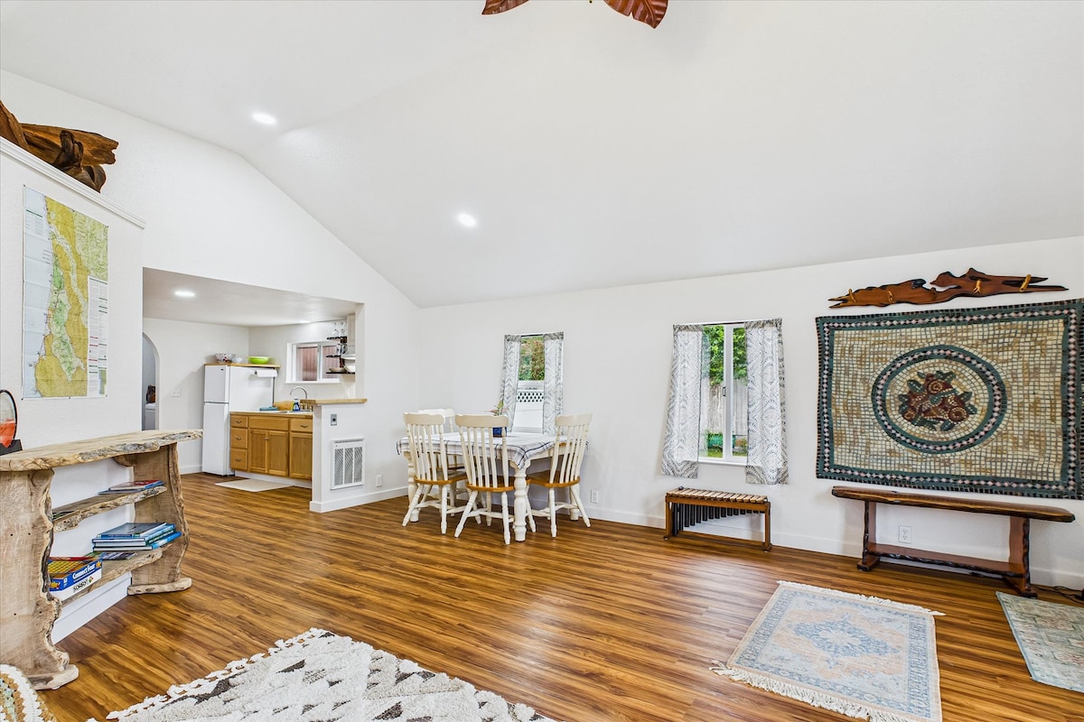 Fáilte go dtí do Theach Beag ar Chósta Humboldt. Múscail agus caife ar an luascán póirse le radhairc oscailte ar Pháirc Náisiúnta Redwood agus ar Chuan Redwood. Ansin siúil, téigh ag marcaíocht, nó tiomáin thar an tréad uilc chuig deargchoillte seanfháis, nó lean an Creek go dtí an tAigéan Ciúin iontach ina bhfuil na mílte trá chomhréidh. Caith níos mó ama ag iniúchadh agus an rochtain is fearr agat ar chrainn mhóra rua, ar thránna áille agus ar iascaireacht iontach. Tar ar ais abhaile chuig an bpoll gráin, an t-imeall, na smóir, tine mór agus scannán, agus tobán te faoi na réaltaí!