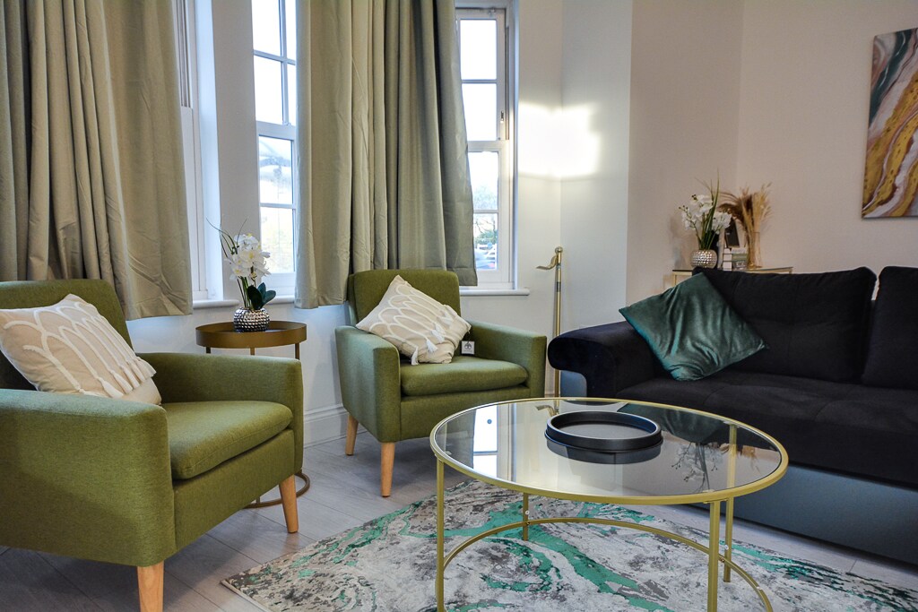 Tá seomra suí ina bhfuil teilifís, tolg leathair agus cathaoir uilleach, bord bia beag agus 2 chathaoir sa svuít chompordach d'aíonna. Tá limistéar dlúth cistine ann atá feistithe le hoigheann comhcheangailte/micreathonnán, iarta, cuisneoir agus gach gréithe agus gréithe cócaireachta riachtanacha. Tá leaba rí frámaithe sa seomra leapa le táblaí cois leapa meaitseála agus tá troscán péine, cuirtíní agus dallóg ar fáil ann. Tá an seomra cithfholcadáin fairsing agus tá sé suite go dtí an seomra leapa. Tá téamh lárnach gáis agus dallóga ar an gcuid is mó de na fuinneoga.