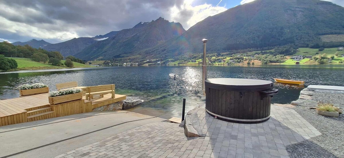 Teach saoire cluthar le radharc iontach ar Hjørundfjorden. Roinnt áiteanna lasmuigh/locháin, teallach agus gríos. Jacuzzi lasmuigh do 5-6 duine. Tá an teach suite 35m ón gcarrchlós ar thalamh claonta. Trá bheag ghainimh agus limistéar comhroinnte beárbaiciú/lasmuigh in aice láimhe. 400m go dtí lár Sæbø le siopaí grósaera, siopaí nideoige, óstán agus ionad campála. Is féidir bád mótair a fháil ar cíos ar chostas breise, cé snámha 50m ón teach. Cuir in iúl dúinn roimh theacht má tá tú ag iarraidh bád a fháil ar cíos.