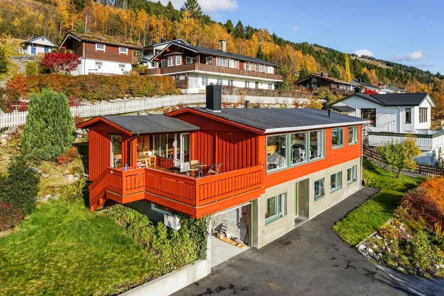 Teach iontach ina bhfuil suíomh tuaithe agus ciúin. Radharc iontach sléibhe agus farraige. Fad siúil go Overåsanden. Tá dhá urlár de thart ar 180 m3 ar cíos. Tá trí sheomra leapa agus seomra folctha amháin ina bhfuil tobán ar urlár an lochta. Tá sé seo in aice leis an máistirsheomra leapa. Tá bealach isteach clúdaithe ar an bpríomhurlár, le seid spóirt/seomra níocháin. Taobh istigh tá halla mór isteach, seomra folctha mór ina bhfuil cithfholcadán, cistin fhairsing (Ó chistin Aisling). Réiteach oscailte do sheomra suí mór 50m3. Seo dhá ghrúpa suí maithe. Teilifíseán agus pianó nua 65" suite ar an mballa