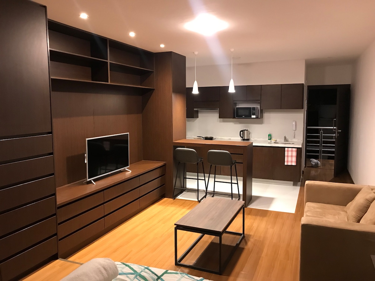 Descansa y disfruta en este moderno monoambiente, diseñado para brindarte confort y tranquilidad. Ubicado en una zona privilegiada, este espacio cuenta con todas las comodidades necesarias, incluyendo Smart TV, WiFi de alta velocidad, lavadora propia. Además, tendrás acceso a piscina (previa reserva), jacuzzi y sauna (pago por uso). Perfecto para viajes de negocios o escapadas a la ciudad. Disponible de parqueos para alquilar en el edificio.