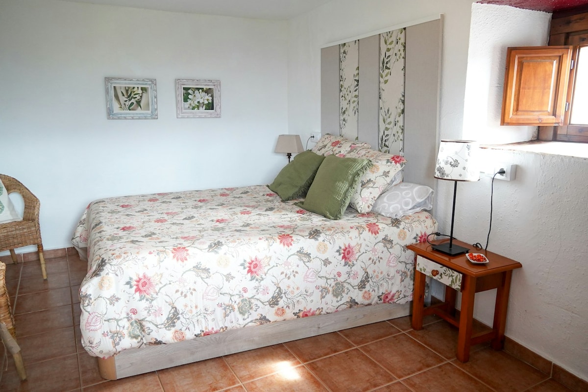 El Cabozo is a charming upper-floor suite for up to 3 guests (2 adults + 1 child). It features a spacious dressing room, cozy attic-style sleeping area with king-size bed, and a stylish bathroom with a large window overlooking the valley. The décor blends elegant vintage pieces with original design furniture, while restored wooden ceilings add warmth and character. WiFi and linens included. Pets not allowed.