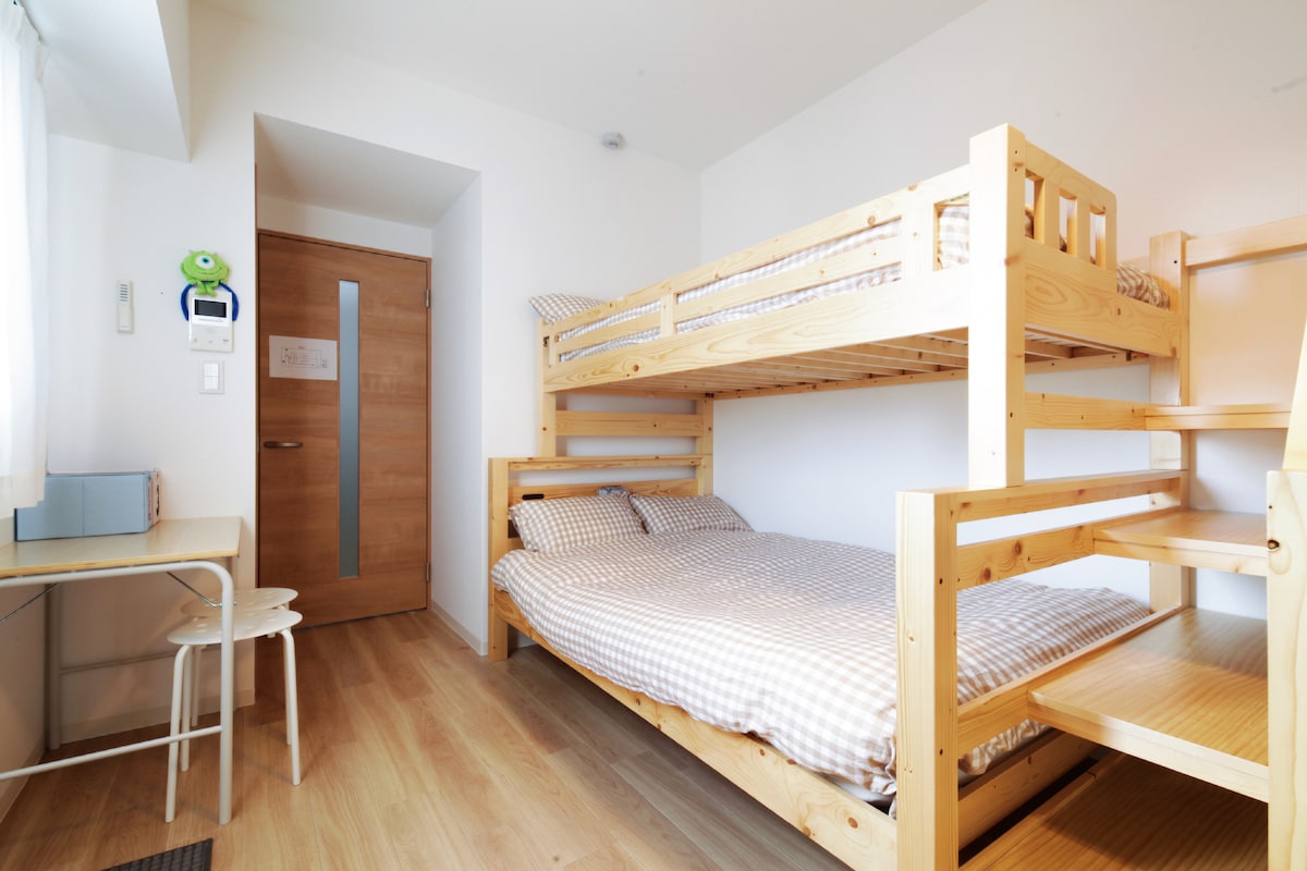 在喧嚣城市的一隅,藏着一间静谧的小屋。 走进这间位于一楼的日式公寓,仿佛回到了属于自己的小小世界。 房间格局 ・上下铺式单人床(2张,长2米 宽1米),适合好友或旅伴安心入住 ・开放式厨房,配备基本的炊具,适合偶尔动手煮一顿简单的家常饭 为避免过敏或异味,室内不提供调味品,请旅客自行准备 卫浴设备 ・干湿分离式浴室,保持清爽整洁 ・配有一次性牙刷、吹风机等基础洗漱用品 ・洗衣机带烘干功能,出差或长住也无需烦恼衣物晾晒 温柔的便利 ・步行范围内有便利店、超市、当地美味餐厅 ・交通方便,散步3分钟即可到达东京晴空塔以及押上(最近)车站,步行15分钟即可达到浅草寺 ,车程50分钟达到梦幻迪士尼城堡乐园,程50分钟到达羽田国际机场,1小时直达成田国际机场,无需转机丝滑抵达。 ・房间位于安静街道一侧,无需担心喧闹,安心入眠