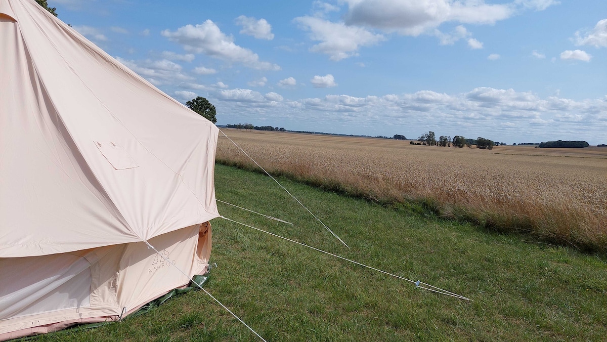 Njut av den härliga miljön på detta romantiska boende i naturen. Bo i ett lyxigt tält med nybäddade sängar och vakna upp utvilad till naturens fågelsång! Tältet hyrs ut per natt inklusive frukost. Du kan bo 1-5 st Tältet är utrustat 5 personer. En dubbelsäng är alltid bäddad. Här kan man sova 1-3 personer. En bäddsoffa kan med ett enkelt grepp dras ut till 2 sovplatser. Dessutom finns en luftmadrass att blåsa upp vid behov. Du sopar och diskar efter dig. Lakan, handdukar och slutstäd ingår.