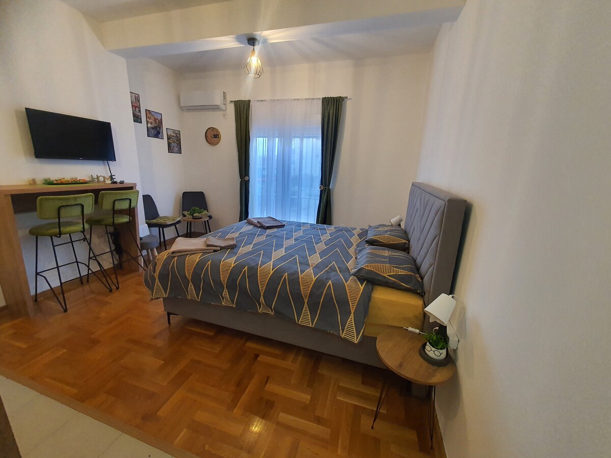 Tá an stiúideo/árasán suite ar an gcéad urlár den teach agus tá a chistin, a sheomra folctha agus a bhalcóin phríobháideach féin ann. Ón mbalcóin, is féidir leat taitneamh a bhaint as radhairc áille de Bhá Boka agus de Chaolas Verige. Tá rochtain ag aíonna ar na hardáin os comhair an tí freisin, atá socraithe ar thrí leibhéal. Cuireann na hardáin seo boird itheacháin agus caife ar fáil, chomh maith le cithfholcadán lasmuigh — foirfe chun do scíth a ligean agus taitneamh a bhaint as aer úr na farraige.