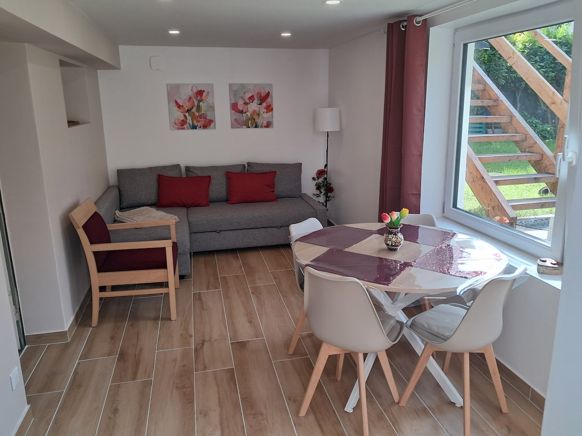 Tá ár n - árasán beag feistithe suite ar imeall Oberschopfheim, go díreach ar na fíniúnacha. Cibé acu siúlóirí, ceardaithe, daoine a bhfuil dúil mhór acu sa dúlra,... - cuirimid fáilte romhat chuig ár n - áit. Is leatsa an t - árasán ina bhfuil cistinéad agus seomra folctha agus is féidir é a ghlasáil. Roinnimid bealach isteach an tí. Bainfidh tú sult as an ngrian an lá ar fad ag do ardán beag. Tá cónaí ar Josef sa teach in éineacht le muc bhoilg a chrochadh Wilhelm agus ár gcat Indie, Hera agus Odin🐷 🐈⬛ 🐈